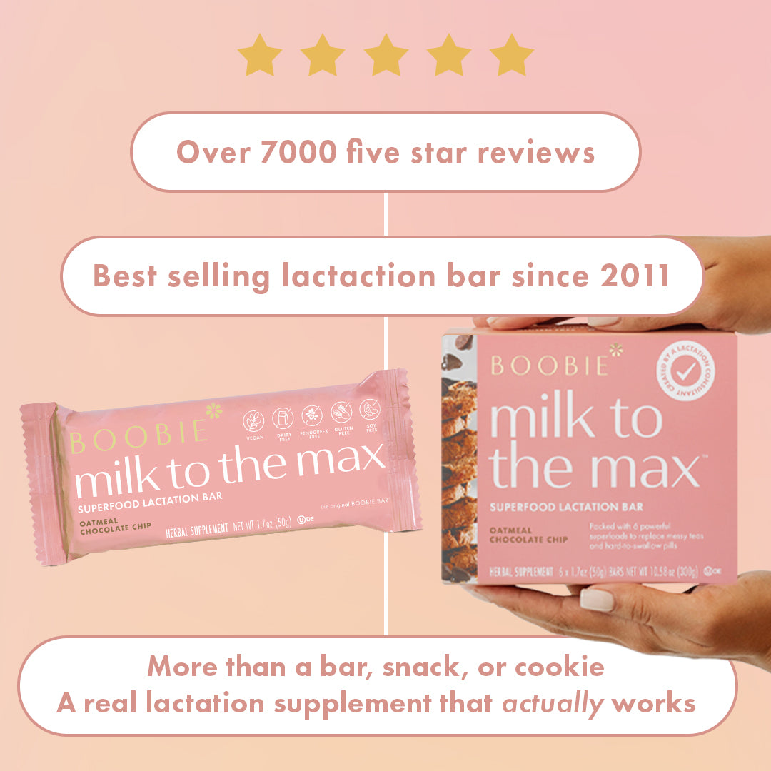 BOOBIE* Bars were the world's first lactation bar invented in 2011 by registered nurse and board-certified lactation consultant and continue to be the #1 trusted bar for lactating moms. BOOBIE* Bars are a comprehensive lactation supplement to assist breast milk production. Instead of using the single herbs used for centuries to promote breast milk supply (called a galactagogue), each bar has 1,480mg of nutritious superfoods and six galactagogues: oats, moringa, shatavari, turmeric, cinnamon, and flaxseed which were traditionally only found in messy pills and teas (who has time for that as a breastfeeding mom?) all baked into ONE yummy bar