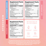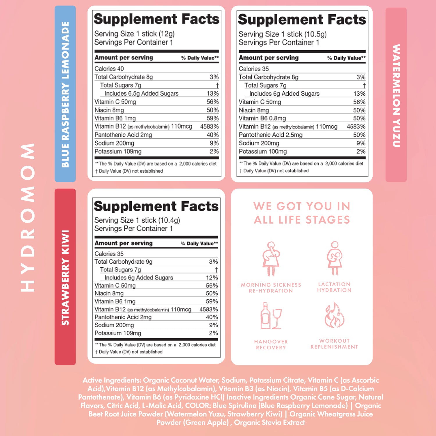 3 sobres Hydromom para obtener energía e hidratación sin cafeína. Sabores: Limonada de Frambuesa Azul, Kiwi Fresa y Yuzu de Sandía.