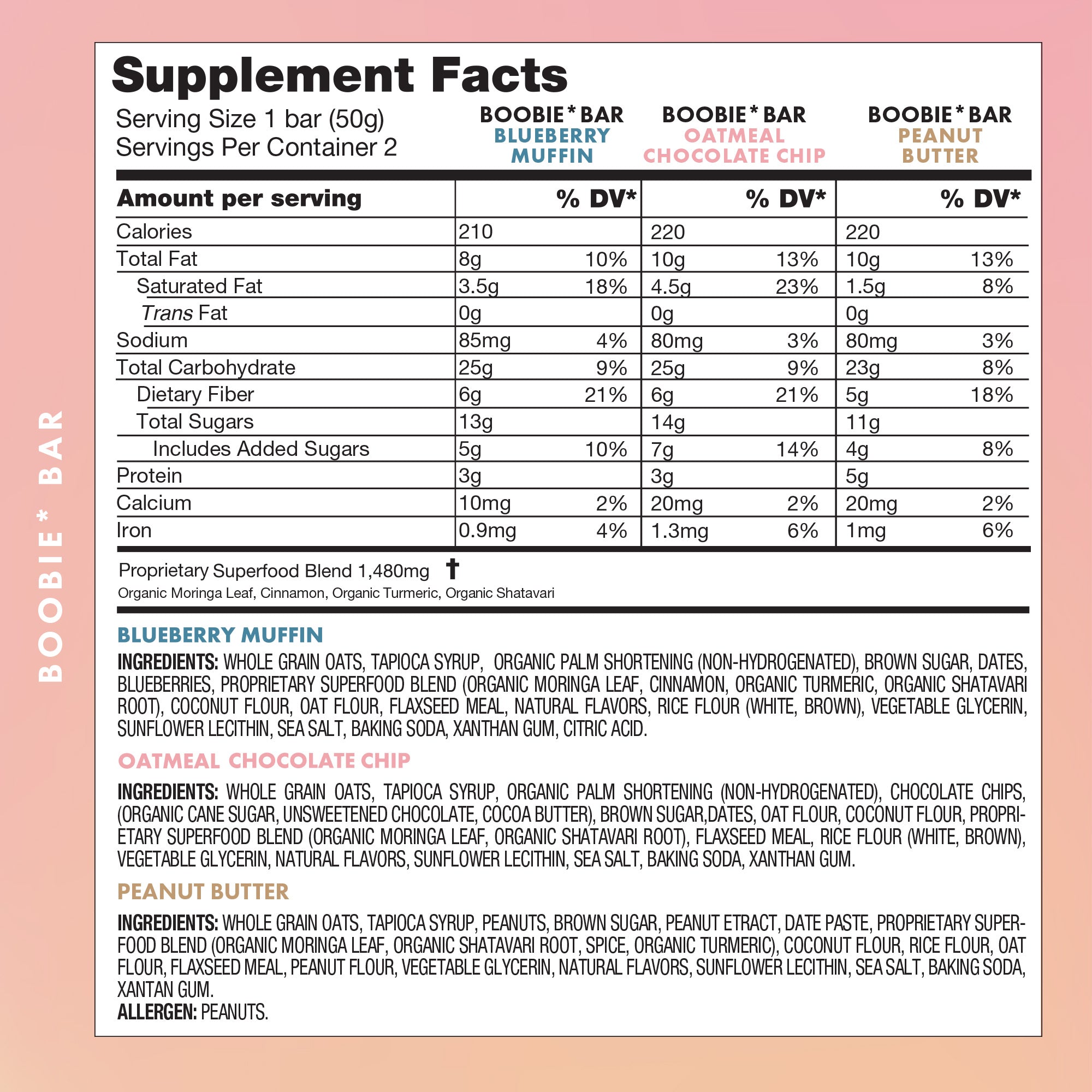 3 barritas Milk to the Max para apoyar la lactancia materna con superalimentos. Sabores: mantequilla de cacahuete, muffin de arándanos y avena con chispas de chocolate.