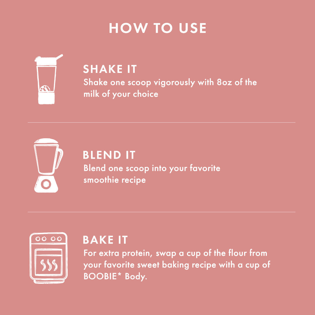 Shake one scoop vigorously with 8oz of the milk of your choice in your BOOBIE* Body Shaker Bottle