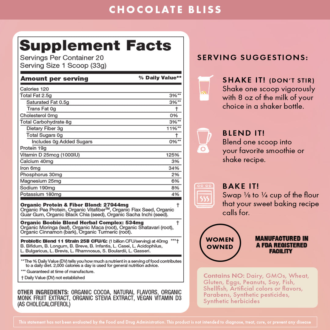Shake one scoop vigorously with 8oz of the milk of your choice in your BOOBIE* Body Shaker Bottle