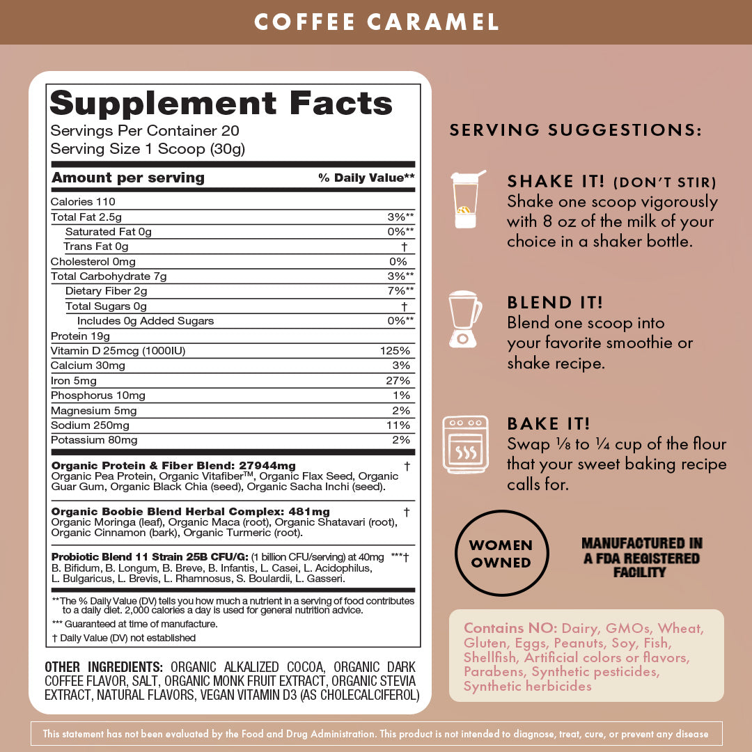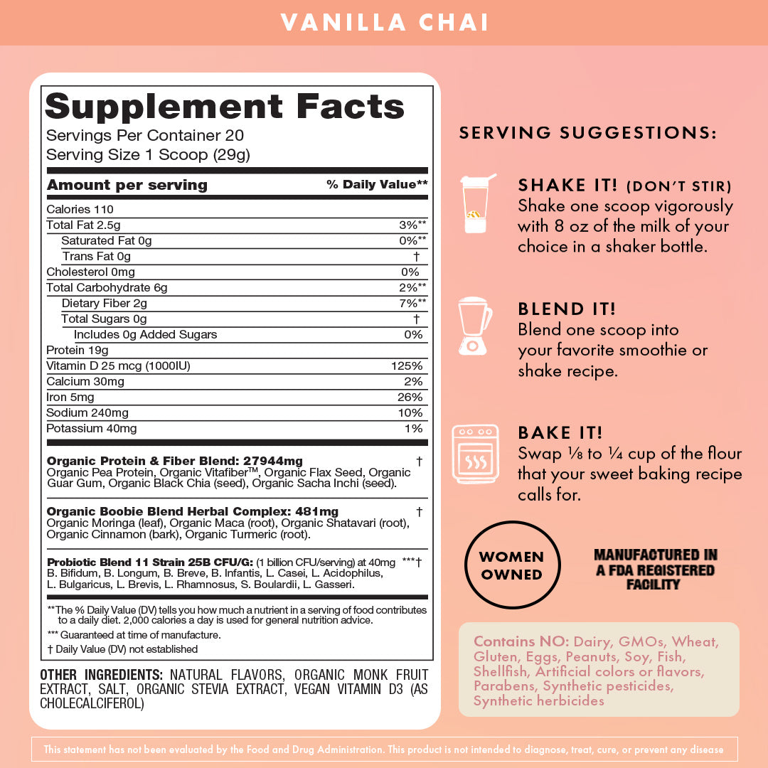 Shake one scoop vigorously with 8oz of the milk of your choice in your BOOBIE* Body Shaker Bottle