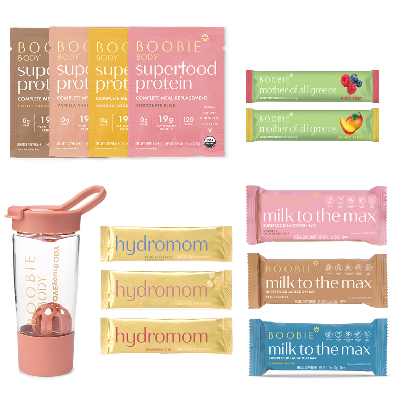 Welcome to motherhood, Mama. Our Try Me Kit includes each flavor of Milk to the Max Bars, Superfood Protein Shakes, Hydromom packets, Mother of All Greens packets and one Shaker Bottle in pink. Sample all of our best-sellers in this Kit, and choose your favorites to support your #momlife journey.