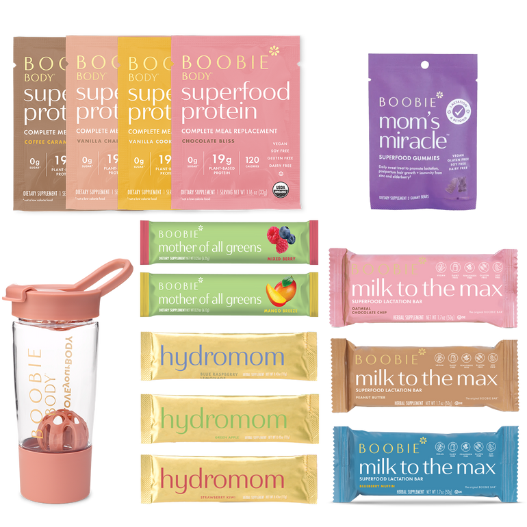 Welcome to motherhood, Mama. Our Try Me Kit includes each flavor of Milk to the Max Bars, Superfood Protein Shakes, Hydromom packets, Mother of All Greens packets and one Shaker Bottle in pink. Sample all of our best-sellers in this Kit, and choose your favorites to support your #momlife journey.